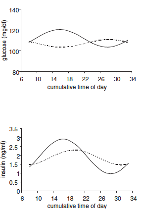 The glucose curve is equally explicable in terms of pathological insulin sensitivity. Just a little insulin lowers the blood glucose and facilitates its oxidation (daytime dip in glucose) and facilitates uptake in to adipocytes to generate glycerol for triglyceride sequestration. Gradually falling insulin due to lower (but not zero) food intake in the early hours of the morning allows some recovery of blood glucose levels, probably assisted by the surge of growth hormone in the early hours of the morning with its mild glucose raising, insulin resistance effect.